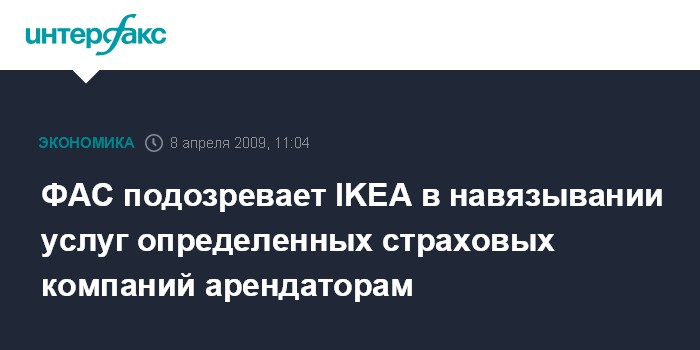 Москва. 8 апреля. INTERFAX.RU - Федеральная антимонопольная служба (ФАС) РФ подозревает "дочку" шведской группы IKEA (ООО "ИКЕА-Мос") в ограничениях на рынке страховых услуг и необоснованном навязывании невыгодных условий договоров арендаторам имущества в своих торговых комплексах.