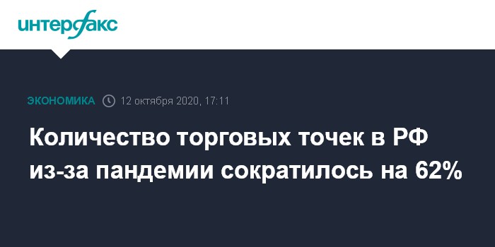 Москва. 12 октября. INTERFAX.RU - Количество торговых точек в РФ к середине июля снизилось на 62% по сравнению с показателем до начала пандемии.