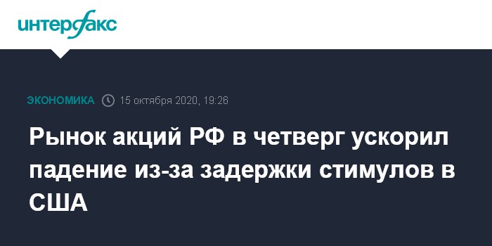 Москва. 15 октября. INTERFAX.RU - Рынок акций РФ в четверг ускорил снижение вслед за мировыми площадками из-за сомнений относительно принятия нового пакета стимулов в США до президентских выборов в стране; индекс РТС обновил минимум с мая, индекс МосБиржи - с 20 июля.