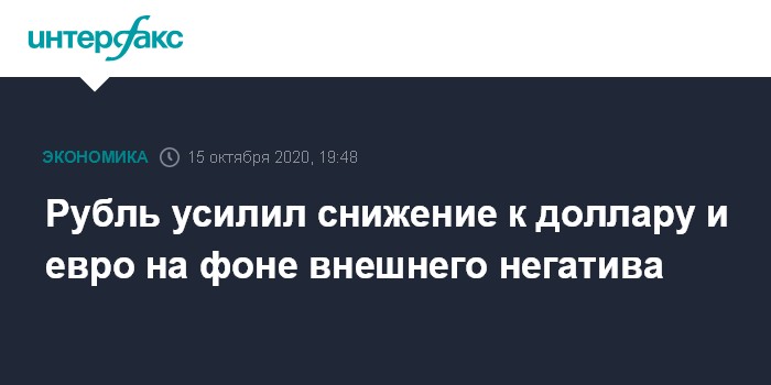 Как отмечают эксперты "Интерфакс-ЦЭА", рубль ускорил снижение к доллару и евро на вечерних торгах на фоне негативных сигналов с мировых рынков и дешевеющей нефти. Игроки выходят из рисковых активов на опасениях нарастания темпов эпидемии COVID-19 и введения новых карантинных мер в ряде стран. Негативное влияние на рынки также оказывают сомнения относительно принятия нового пакета стимулов в США до президентских выборов в стране и ухудшение данных макроэкономической статистики.