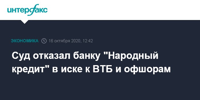 Москва. 16 октября. INTERFAX.RU -Арбитражный суд Москвы в пятницу отказал находящемуся в процедуре банкротства банку "Народный кредит" в иске к ВТБ, ООО "Региональная инвестиционная компания" (РИК) и еще трем юрлицам о выплате компенсации за неправомерно утраченную долю, следует из картотеки суда.