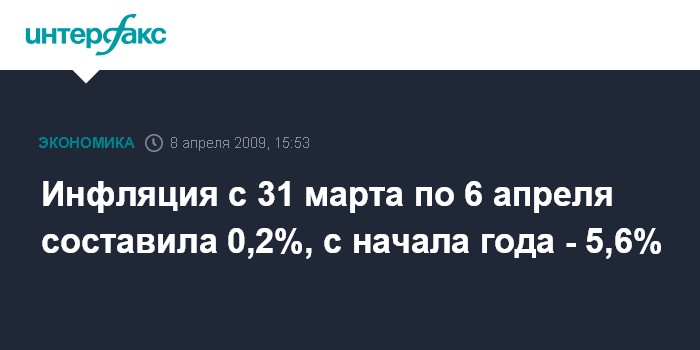 Москва. 8 апреля. INTERFAX.RU - Инфляция в РФ с 31 марта по 6 апреля составила 0,2%, с начала месяца - также 0,2%, говорится в сообщении Росстата. Инфляция за период с начала 2009 г. достигла 5,6%.