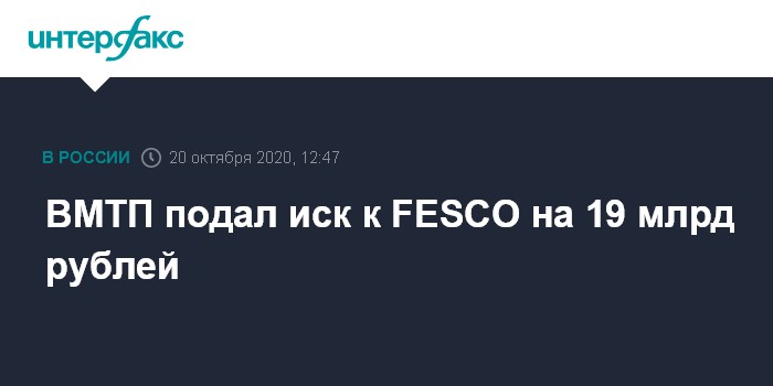 Москва. 20 октября. INTERFAX.RU - Арбитражный суд Москвы зарегистрировал иск ПАО "Владивостокский морской торговый порт" (ВМТП, крупнейшая стивидорная компания в порту Владивосток, входит в группу FESCO) к ПАО "Дальневосточное морское пароходство" (ДВМП, базовая компания FESCO) на 19,18 млрд рублей.