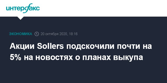 Москва. 20 октября. INTERFAX.RU - Акции ПАО "Соллерс" вечером во вторник подскочили почти на 5% и обновили максимум с февраля текущего года после известий, что совет директоров компании на заседании 23 октября рассмотрит вопрос о приобретении акций группы.