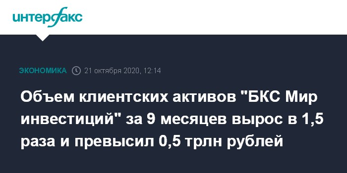 Москва. 21 октября. INTERFAX.RU - Объем клиентских активов холдинга "БКС Мир инвестиций" за 9 месяцев 2020 года увеличился на 45%, или 178 млрд рублей, и составил на 1 октября 573 млрд рублей (брокерские счета, ИИС, активы в доверительном управлении, структурные продукты и ПИФы). Динамика роста оказалась в три раза выше, чем за аналогичный период прошлого года, сообщили "Интерфаксу" в компании.