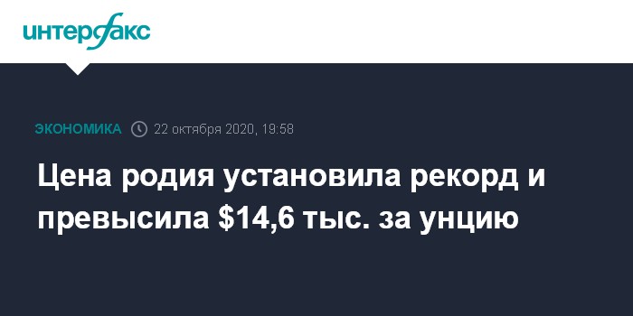 Москва. 22 октября. INTERFAX.RU - Цена родия поднялась в октябре выше $14,6 тыс. за унцию, что является рекордным уровнем, сообщает Trading Economics.