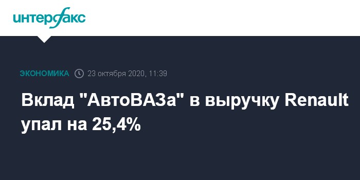 Москва. 23 октября. INTERFAX.RU - Вклад АО "АвтоВАЗ" в общий показатель выручки французского автопроизводителя Renault по итогам девяти месяцев 2020 года составил 1,752 млрд евро, что на 25,4% меньше, чем годом ранее, сообщила Renault.