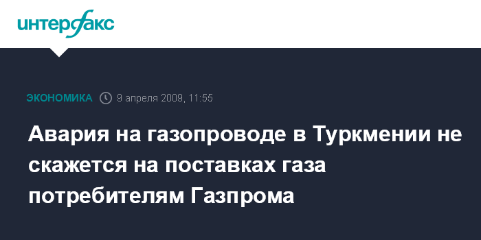 Как сообщило управление информации концерна, "утром 9 апреля "Туркменгаз" проинформировал "Газпром" о том, что 9 апреля в 01:32 произошел разрыв с возгоранием на 487 км газопровода Давлетбат - Дариялык. Начиная с этого времени транспортировка туркменского газа в Россию не осуществляется".
