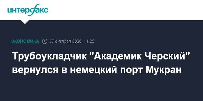 Москва. 27 октября. INTERFAX.RU - Российский трубоукладчик "Академик Черский" спустя три недели пребывания у берегов западного российского анклава вернулся в германский порт Мукран, где находится логистический терминал проекта строительства "Северного потока 2", свидетельствуют данные системы позиционирования морских судов.