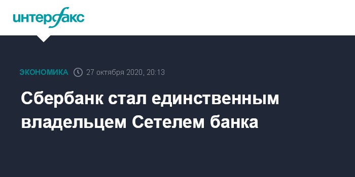 Москва. 27 октября. INTERFAX.RU - Сбербанк России увеличил свою долю в Сетелем банке с 79,2% до 100%, следует из материалов Сбербанка.