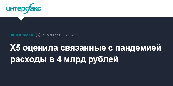 Москва. 27 октября. INTERFAX.RU - Расходы X5 Retail Group, связанные с пандемией COVID-19, оцениваются в 4 млрд рублей в 2020 году.