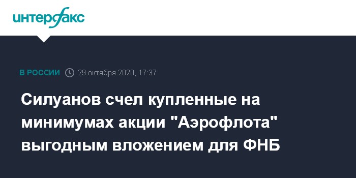 Москва. 29 октября. INTERFAX.RU - Акции "Аэрофлота", которые были приобретены в рамках допэмиссии для поддержки деятельности компании в условиях пандемии COVID-19, могут стать для Фонда национального благосостояния выгодной инвестицией, считает глава Минфина Антон Силуанов.