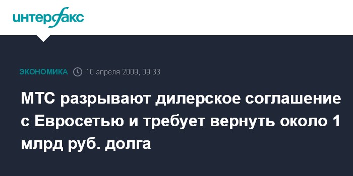 Москва. 10 апреля. INTERFAX.RU - ОАО "Мобильные Телесистемы" (МТС) в четверг вечером направило "Евросети" уведомление о расторжении дилерского соглашения.