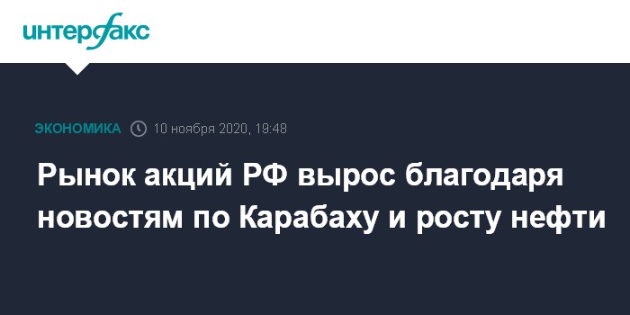 Москва. 10 ноября. INTERFAX.RU - Рынок акций РФ во вторник продолжил подъем благодаря снижению геополитической напряженности после соглашения о завершении войны в Нагорном Карабахе и возобновлению роста нефти на фоне новостей об успешном испытании компаниями Pfizer и BioNTech вакцины от COVID-19.