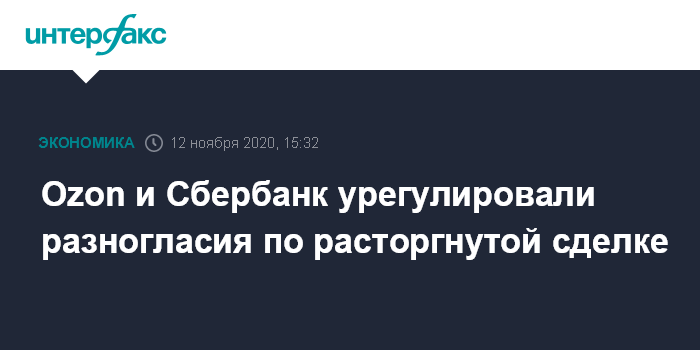 Москва. 12 ноября. INTERFAX.RU - Ozon и Сбербанк урегулировали разногласия, связанные с расторгнутой сделкой, разрыв договора о которой предусматривал break-up fee в пользу банка в 1 млрд рублей.