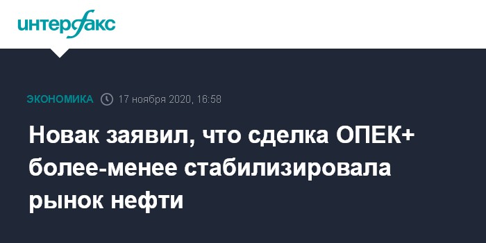 Москва. 17 ноября. INTERFAX.RU - Сделка ОПЕК+ стабилизировала нефтяной рынок, но необходимо продолжать исполнять взятые обязательства, заявил вице-премьер РФ Александр Новак на заседании Объединенного министерского мониторингового комитета (Joint Ministerial Monitoring Committee, JMMC).