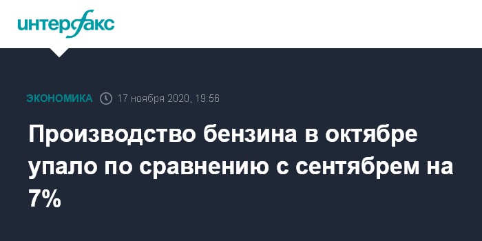 Москва. 17 ноября. INTERFAX.RU - Производство бензина в России в октябре упало на 7%, как по сравнению с сентябрем, так и к октябрю 2019 года, сообщает Росстат.