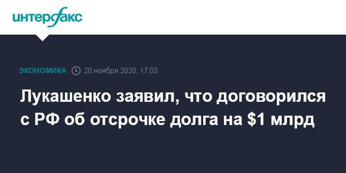 Москва. 20 ноября. INTERFAX.RU - Российская сторона предоставила Минску отсрочку по уплате в текущем году $1 млрд госдолга, заявил президент Белоруссии Александр Лукашенко.