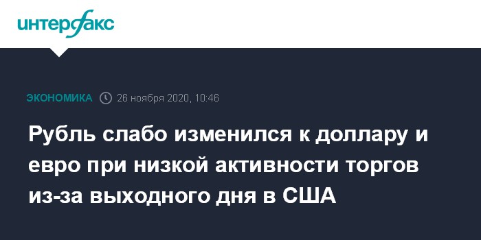 Как отмечают эксперты "Интерфакс-ЦЭА", рубль слабо меняется к доллару и евро на старте торгов в связи с низкой активностью участников большинства мировых рынков из-за праздничного выходного дня в США, где в четверг отмечается День благодарения. Участники валютных торгов оценивают последние данные американской макроэкономической статистики и протоколы последнего заседания Федеральной резервной системы, опубликованные накануне.