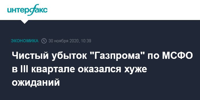 Москва. 30 ноября. INTERFAX.RU - Чистый убыток "Газпрома" по международным стандартам (МСФО) в третьем квартале 2020 года составил 251,297 млрд рублей (после прибыли в 211,789 млрд рублей за аналогичный период 2019 года), сообщила компания.