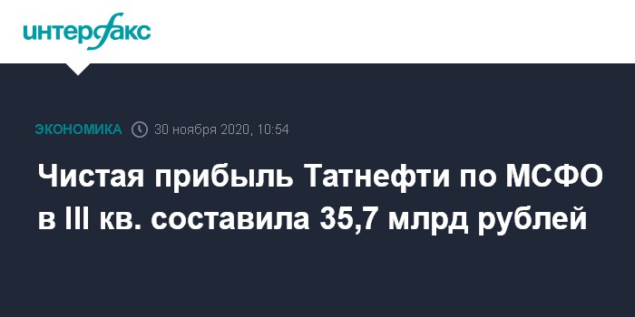Москва. 30 ноября. INTERFAX.RU - Чистая прибыль "Татнефти" в третьем квартале 2020 года составила 35,745 млрд рублей против 17,6 млрд руб. во II кв. и против 58,4 млрд рублей годом ранее, говорится в отчете компании.