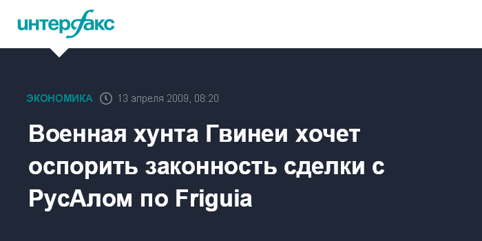 Москва. 13 апреля. INTERFAX.RU - Правящая в Гвинее военная хунта намерена подать иск в суд, чтобы аннулировать сделку по продаже российскому "РусАлу" в 2006 году боксито-глиноземного комплекса Friguia, сообщает агентство Bloomberg.