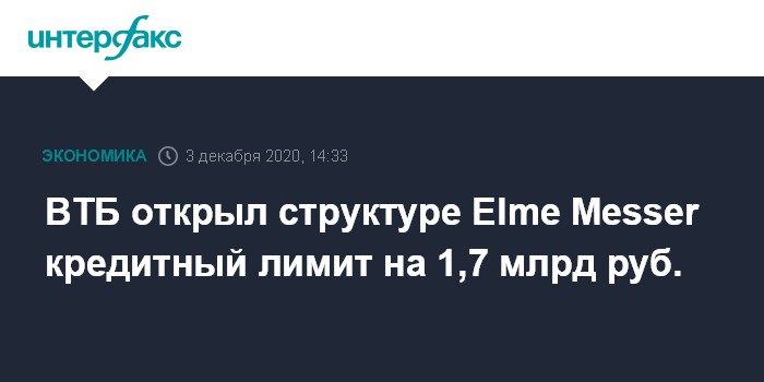 Москва. 3 декабря. INTERFAX.RU - ВТБ установил ООО "Елме Мессер Рус" (входит в эстонскую Elme Messer Gaas) кредитно-документарный лимит на сумму более 1,7 млрд рублей, сообщили "Интерфаксу" в пресс-службе кредитной организации.