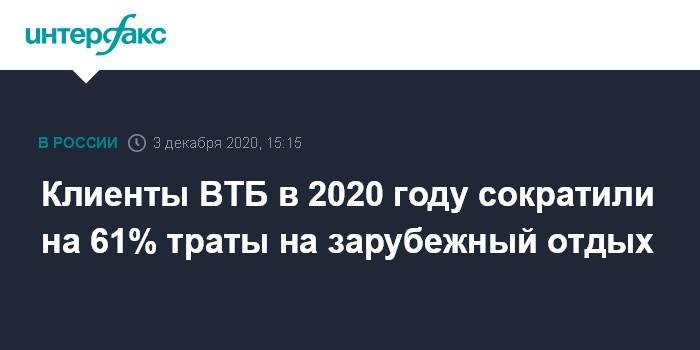 Москва. 3 декабря. INTERFAX.RU - Расходы российских клиентов ВТБ во время поездок за границу в 2020 году снизились на 61% в годовом измерении и составили 31 млрд рублей, сообщила пресс-служба банка со ссылкой на данные карточных транзакций.