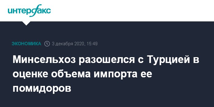 Москва. 3 декабря. INTERFAX.RU - Минсельхоз РФ сохраняет свою позицию в отношении поставок томатов из Турции, обещая рассмотреть вопрос о квоте после ее полной выборки. При этом в министерстве привели свои данные по импортированным турецким помидорам.