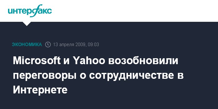 Москва. 13 апреля. INTERFAX.RU - Microsoft Corp. и Yahoo Inc., переговоры о слиянии которых провалились в прошлом году, вновь начали обсуждать возможность партнерства в Интернете, сообщают Financial Times и Wall Street Journal со ссылкой на свои источники.