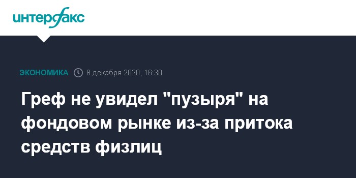 Москва. 8 декабря. INTERFAX.RU - Президент, председатель правления Сбербанка Герман Греф не видит "пузыря" на российском фондовом рынке из-за притока туда средств физлиц.