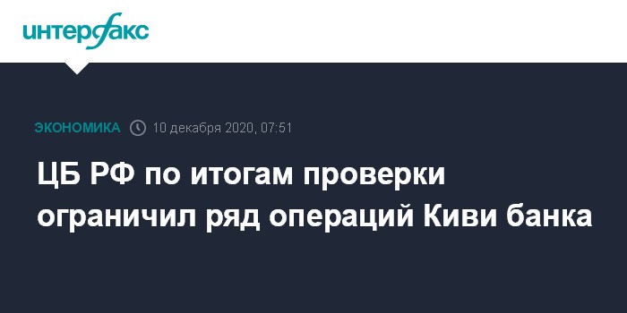 Москва. 10 декабря. INTERFAX.RU - ЦБ РФ по итогам проверки Киви банка ввел с 7 декабря 2020 года ограничения на ряд его операций, в частности, на большинство платежей в пользу иностранных торговых компаний и перевод денег на предоплаченные карты корпоративных клиентов, говорится в сообщении Qiwi.
