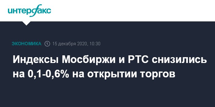 Москва. 15 декабря. INTERFAX.RU - Торги на российском рынке акций во вторник начались снижением цен blue chips на фоне ухудшения внешней фондовой и сырьевой конъюнктуры из-за роста числа заболеваний COVID-19 в мире и возвращения карантинных мер во многих странах.