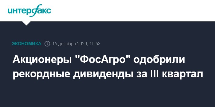 Москва. 15 декабря. INTERFAX.RU - Акционеры "ФосАгро" одобрили выплату дивидендов в размере 123 рубля на акцию (41 рубль на GDR) из нераспределенной чистой прибыли по состоянию на 30 сентября, сообщила компания.