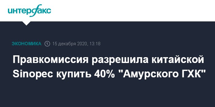 Правкомиссия разрешила китайской Sinopec купить 40% "Амурского ГХК"