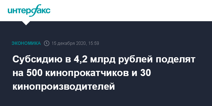 Москва. 15 декабря. INTERFAX.RU - Правительственную субсидию в 4,2 млрд рублей, выделенную из резервного фонда на поддержку киноотрасли, получат 500 прокатчиков и 30 кинопроизводителей, сообщил на пресс-конференции замминистра культуры Максим Ксензов.