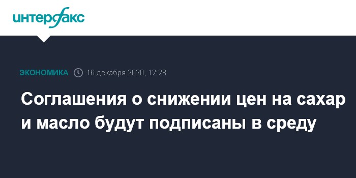 "Сегодня будут подписаны соглашения о снижении цен на сахар и подсолнечное масло министерством сельского хозяйства, министерством промышленности и торговли и отраслевыми ассоциациями, а также рядом крупнейших торговых сетей. Далее к нему присоединятся и другие, в том числе региональные торговые сети и поставщики", - сказал он.