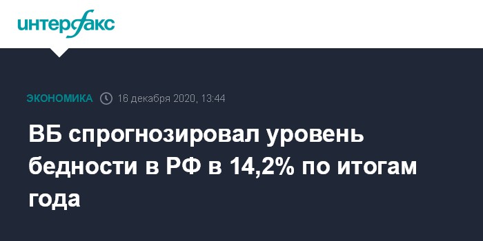 Москва. 16 декабря. INTERFAX.RU - Уровень бедности в России по итогам 2020 года при условии падения ВВП на 4% может составить 14,2%. Такой прогноз содержится в традиционном докладе Всемирного банка о российской экономике, опубликованном в среду.