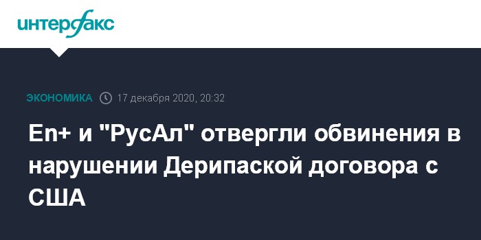Москва. 17 декабря. INTERFAX.RU - En+ и "РусАл" заявили, что опровергают появившуюся информацию о том, что Олег Дерипаска продолжает принимать непосредственное участие в управлении "РусАлом" и влиять на его менеджмент в нарушение соглашения между Минфином США и компаниями En+ и "РусАл".