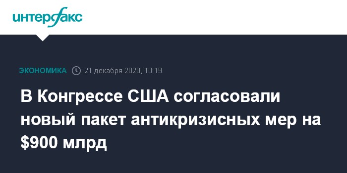 Москва. 21 декабря. INTERFAX.RU - Лидеры Конгресса США в воскресенье, 20 декабря, согласовали пакет мер поддержки экономики в условиях пандемии коронавируса общим объемом порядка $900 млрд, сообщают американские СМИ со ссылкой на лидера республиканского большинства в Сенате Митча Макконнелла.