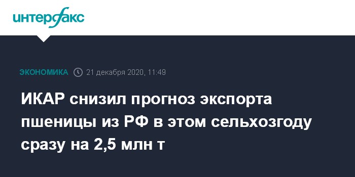 ИКАР снизил прогноз экспорта пшеницы из РФ в этом сельхозгоду сразу на 2,5 млн т