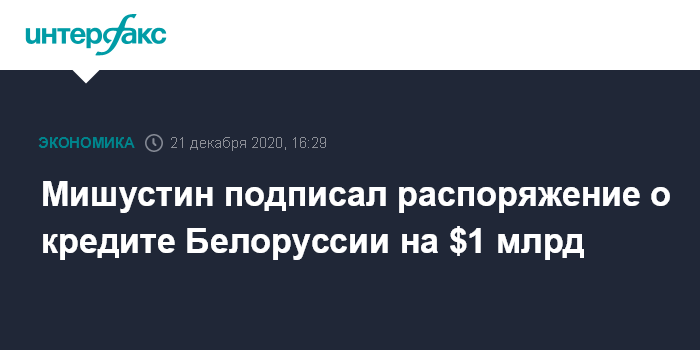 Москва. 21 декабря. INTERFAX.RU - Премьер-министр РФ Михаил Мишустин подписал распоряжение о предоставлении Белоруссии межгосударственного кредита объемом $1 млрд, следует из опубликованного на официальном интернет-портале правовой информации документа.