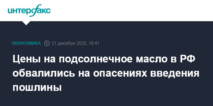 Как сообщалось, РФ ввела экспортную пошлину на подсолнечник и рапс в размере 30%, но не менее 165 евро за тонну. Пошлина будет действовать с 9 января по 30 июня 2021 года. В настоящее время экспорт подсолнечника облагается пошлиной в 6,5%, но не менее 9,75 евро за тонну, рапс - 6,5%, но не менее 11,4 евро за тонну.