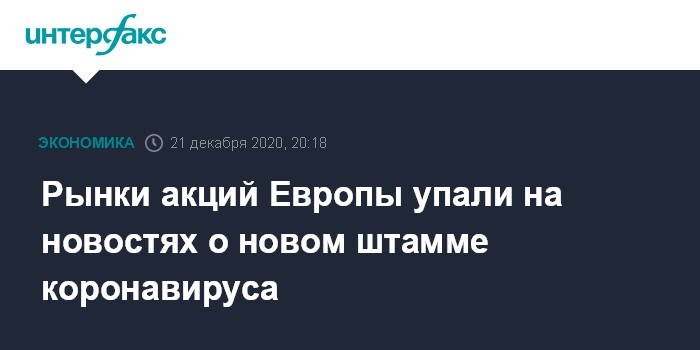 Москва. 21 декабря. INTERFAX.RU - Фондовые индексы стран Западной Европы заметно снизились по итогам торгов в понедельник на новостях об обнаружении в Великобритании новой разновидности коронавируса.
