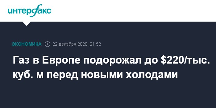 Цена газа на голландском хабе TTF (контракт "на сутки вперед") с поставкой в среду выросла до нового локального рекорда – $220 за тысячу кубометров. Это максимальное значение за последние 22 месяца – с 5 февраля 2019 года.