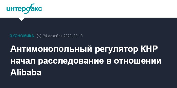 Москва. 24 декабря. INTERFAX.RU - Государственное управление по регулированию рынка Китая начало расследование в отношении онлайн-ритейлера Alibaba Group Holding Ltd., который подозревается в заключении эксклюзивных соглашений о сделках и совершении других видов монополистической деятельности, сообщает агентство "Синьхуа".