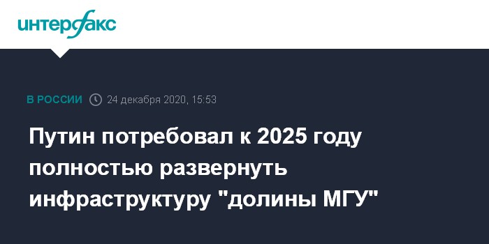 Москва. 24 декабря. INTERFAX.RU - Президент Владимир Путин потребовал запустить первые объекты научно-технологической долины МГУ в ближйашие полтора-два года, а к 2025 году раазвернуть в полном объеме всю инфраструткуру. Он заявил об этом на заседании попечительского совета МГУ, оно проходит в режиме видеоконференции.