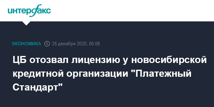 ЦБ отозвал лицензию у новосибирской кредитной организации "Платежный Стандарт"