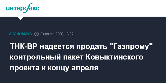 ТНК-BP надеется продать "Газпрому" контрольный пакет Ковыктинского проекта к концу апреля