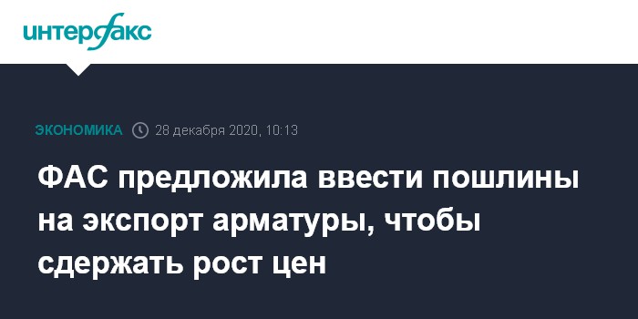 ФАС предложила ввести на шесть месяцев экспортные пошлины на всю металлопродукцию — от сырья до верхних переделов, пишет газета, ссылаясь на письмо службы Минпромторгу. Предложение подготовили по поручению Хуснуллина после обращения Национального объединения застройщиков жилья на резкий рост цен. 23 декабря вице-премьер говорил в Госсовете, что за месяц арматура на внутреннем рынке подорожала на 40%.